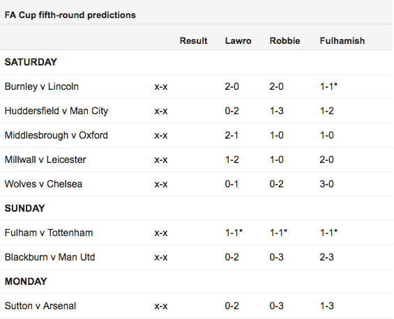 As such, to be asked to challenge the man himself for this week’s FA Cup fixtures was a dream come true, and you can have a look at the table of predictions below. As you can see, we’ve also been pitted against Robbie of the now infamous ArsenalFanTV, so we’ll be hoping that whilst we take down top-flight opposition, that Fulham will do the same.