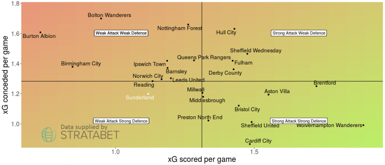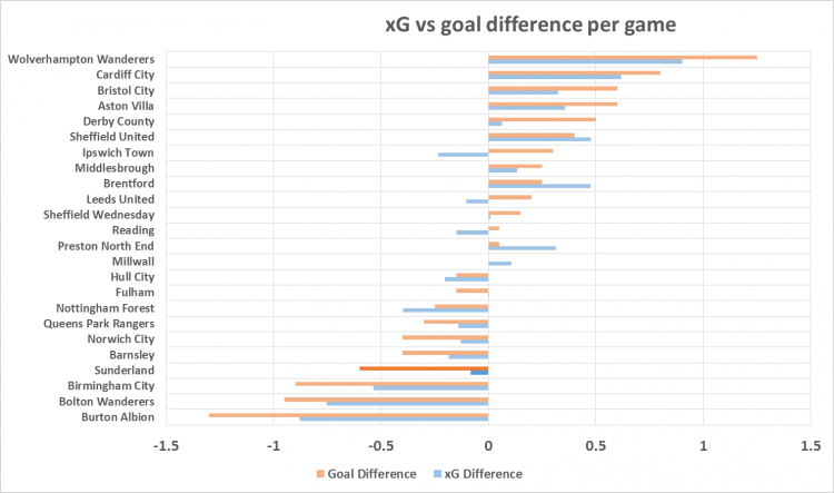 Sunderland are clearly underperforming against their expected numbers. Whilst there’s always a debate over whether this is down to poor finishing skill, there’s clearly an element of luck, or lack of it, which has affected Sunderland. If they continue to perform as they are, this should right itself, and I wouldn’t be surprised if they quickly climbed back up the league.