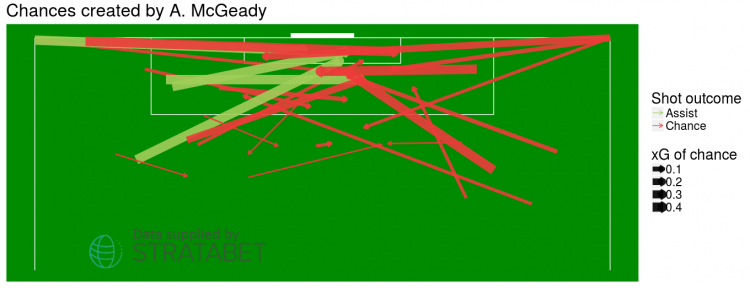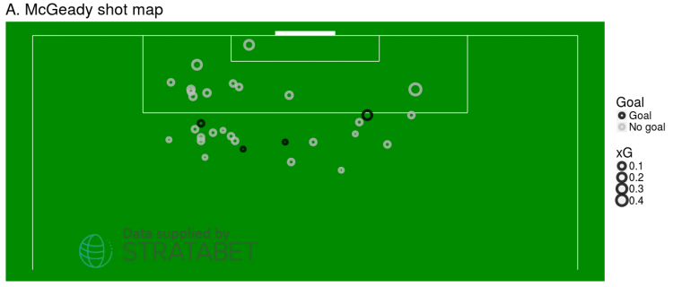 Classically – around 5% of shots from outside the area go in. McGeady is scoring at a rate 4 times this.