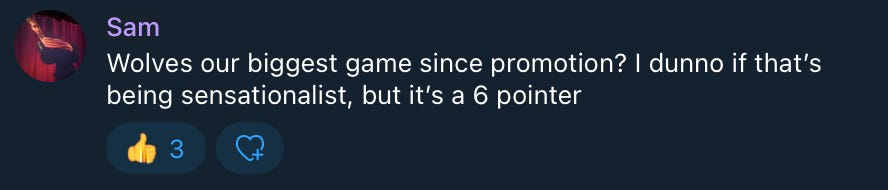 So no, it’s not a crisis by any stretch of the imagination. However, a crisis is right around the corner. This comment from Sam in the Fulhamish Telegram sums up the situation we find ourselves in ahead of (winless) Wolves next week. Lose that, and I think we can start to panic.