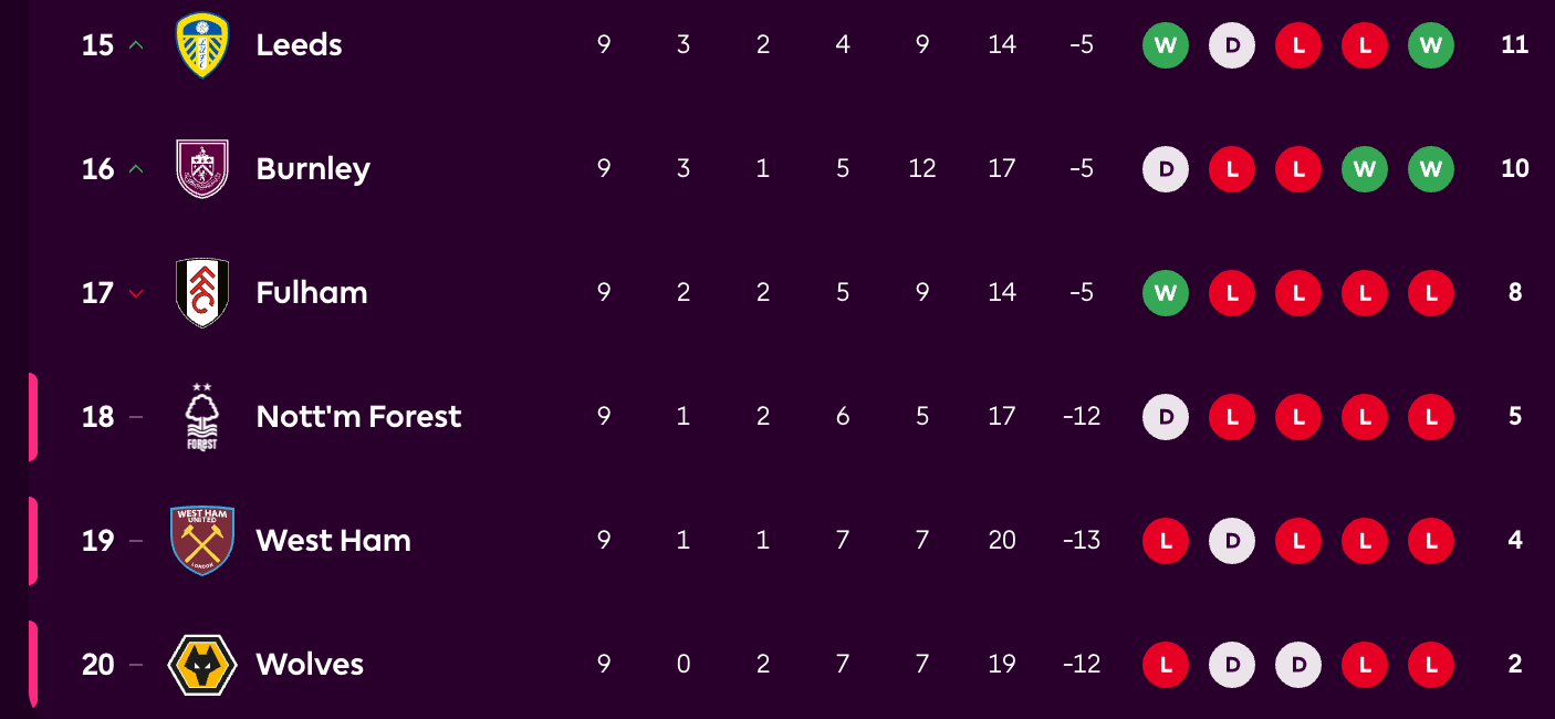 The fact that the teams who came up are more competitive is great for the neutral, but not for a team like Fulham. Burnley and Leeds will still be in the mix to go down, but you’d imagine that Sunderland’s fast start will keep them at an arm’s length from the mess at the bottom. The hope has to be that the respective crises at Wolves, West Ham and Forest continue indefinitely.
